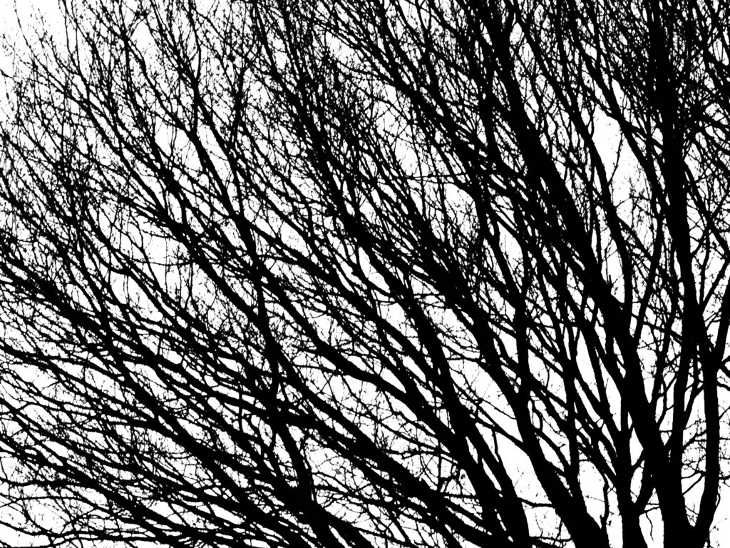 Es war auch das ideale Motiv für den Monotonfilter der OM-D, denn die Schwarzweiß-Ausarbeitung lenkt das Auge meiner Meinung nach erst richtig gezielt auf die Struktur des kargen Gerippes mit seinen unzähligen Linien und Verzweigungen. In Lightroom habe ich außer der Ausschnittvergrößerung nur noch die Gradation durch totales Aufziehen der Lichter- und Tiefenregler bis an deren Ende vorgenommen.