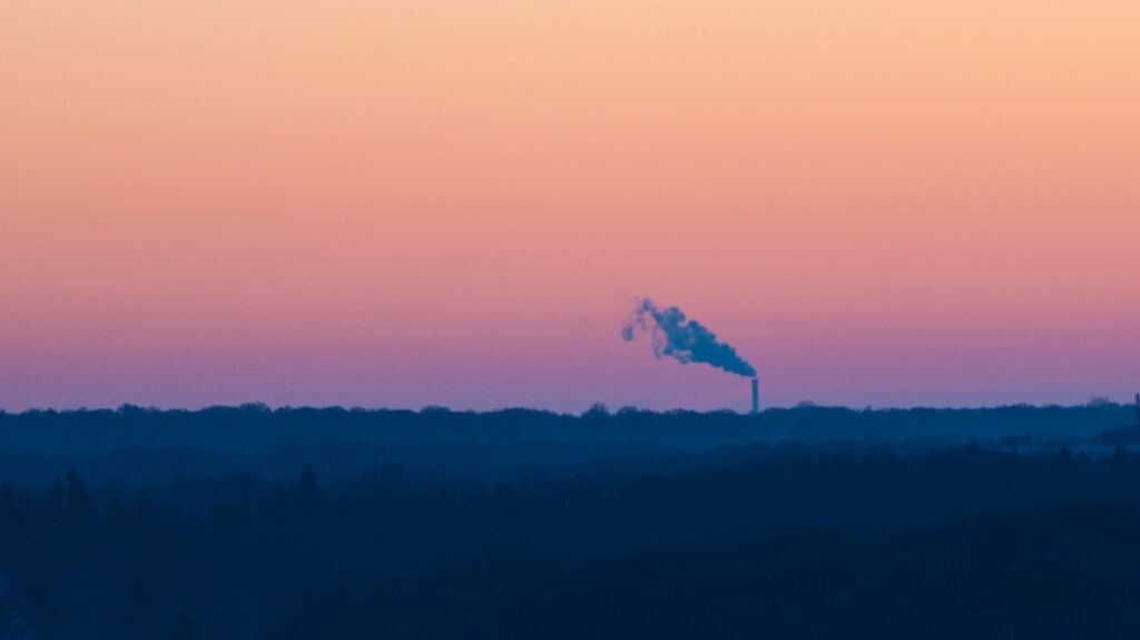 Ich nahm daher oft meine Kamera mit zur Arbeit, immer in der Hoffnung auf einen spektakulären Sonnenaufgang. An diesem Tag waren die Farben wieder zu sehen. Es war ein wolkenloser Morgenhimmel, die Sonne war noch nicht aufgegangen. Es war sozusagen die Grenze zwischen Nacht und Tag. In der Ferne konnte man den Schornstein der Müllverbrennungsanlage beobachten, wie der seinen Qualm in den Morgenhimmel ausspie.