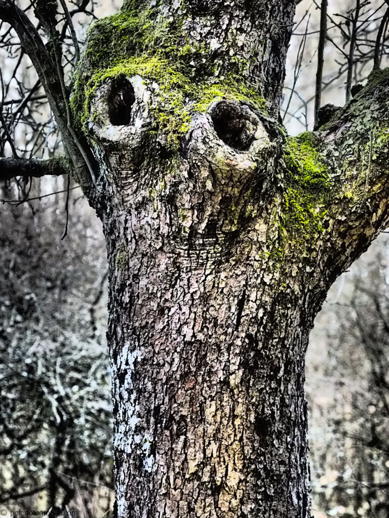 Erst auf dem Rückweg fiel mir dieser Baum auf. Zwei Äste, die ehemals ziemlich mächtig gewesen sein mussten, waren aus dem Stamm gebrochen. Es waren nun zwei tiefe Baumhöhlen zu sehen. Diese lagen zufällig so dicht beisammen, als sei es ein Augenpaar. Und schon kam mir die Geschichte in den Sinn: Wir glauben, wir seien allein im Wald. Aber wir werden beobachtet. Wer weiß, was hier bei Nacht geschieht…