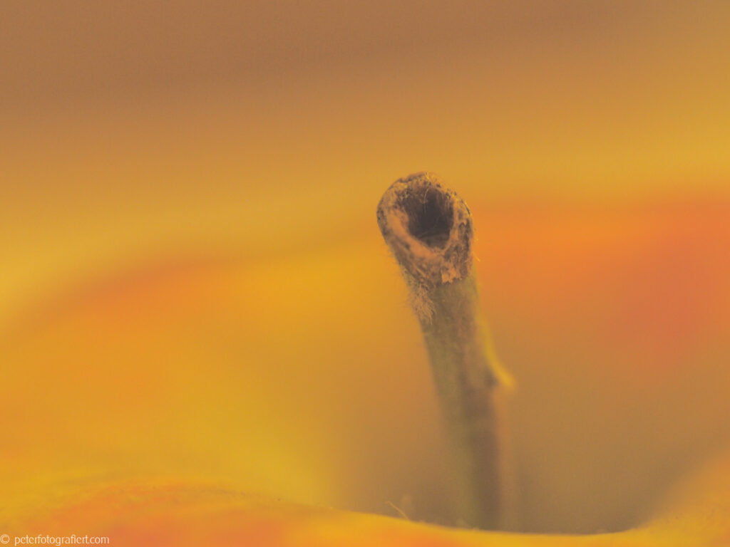 Für dieses Foto suchte ich mir einen Apfel in schöner Rot-Gelb-Färbung aus. Um den Stiel, den „Nabel“, hervorzuheben, fotografierte ich ihn als Nahaufnahme mit dem Makroobjektiv mZuiko 60 mm f/1,8 und hatte dabei noch die Idee, den in der OM-D enthaltenen Filter „Blasse Farben“ zu verwenden. Der sorgte für eine schöne sanft fließende, warme Ton-in-Ton-Färbung des Bildes.