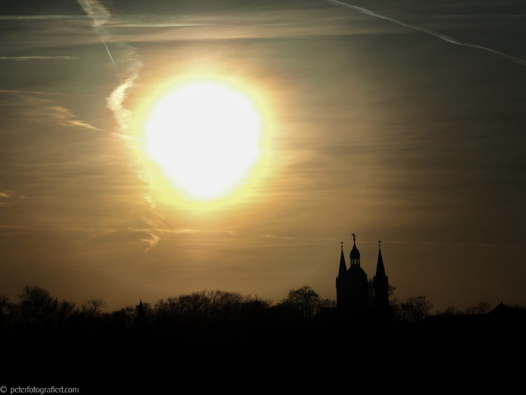Die Basilika von Seligenstadt lässt mir keine Ruhe. Schon so oft habe ich versucht, sie möglichst gelungen in Szene zu setzen. Auch dieses Mal stand ich wieder am gegenüber liegenden Mainufer als die Sonne wie eine riesige helle Scheibe schon ziemlich tief stand. Durch das Gegenlicht bildete sich eine interessante dunkle Silhouette der Basilika. Es wirkte sehr verheißungsvoll.